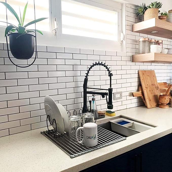 - Easy to Save Counter Space and Store : The dish drying rack for kitchen sink allows you to lay flat and roll up quickly and easily, then put away after using. And you can store the folding dish drying rack over the sink in cabinet when it’s not in use. The adjustable dish draining rack makes it free up more counter space than traditional dish drainer for kitchen sink. It’s a must have for home and kitchen organization and storage. Great for use in kitchen, RV, dormitory, farmhouse and more