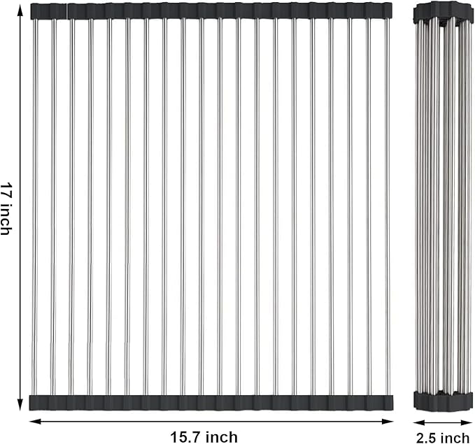 - Size : The size of the over sink dish drying rack is 17"x15.7". And you can also fold or cut the collapsible sink drying rack according to your sink size for better use. Please kindly measure your sink size firstly before purchasing this roll up dish drying rack over sink. A great helper for home accessories and kitchen necessities. With this small kitchen gadget, your kitchen and home will be much tidier and comfortable