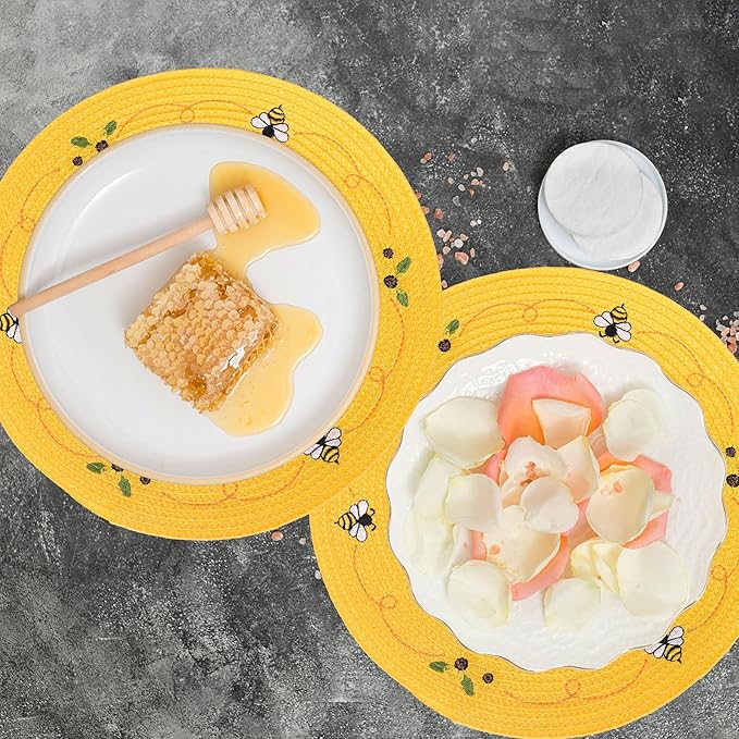 Whaline 4Pcs Round Placemats Bee Sunflower Embroidered Place Mats Bee Floral Dinner Table Mats for Home Spring Summer Holiday Birthday Baby Shower Party Decor