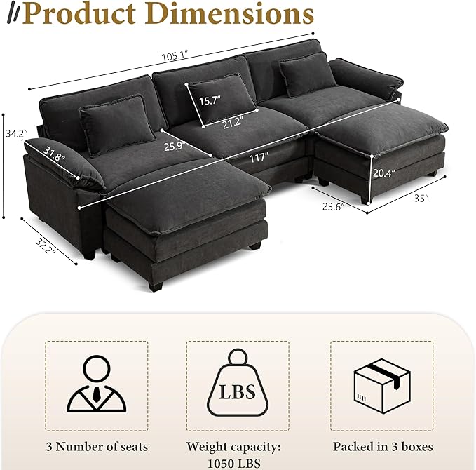 - Easy to Assemble: Comes with clear instructions and tools,this sectional couch can be easily assembled in 30 minutes.Couch Dimensions: 86''(W)*57''(D)*34.6''(H). Weight Capacity: 300 lbs. each seat, It can hold 2-3 people to sit on, and you can also feel free to take a nap on the sofa