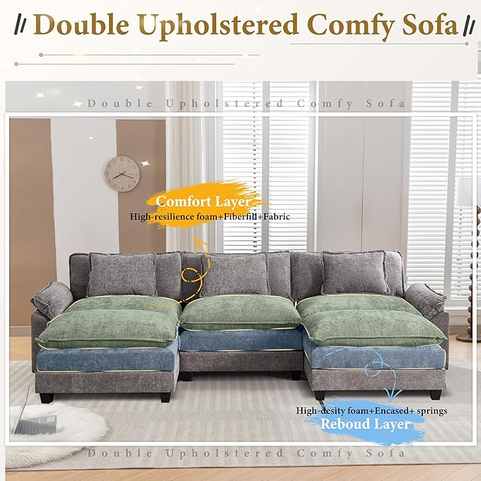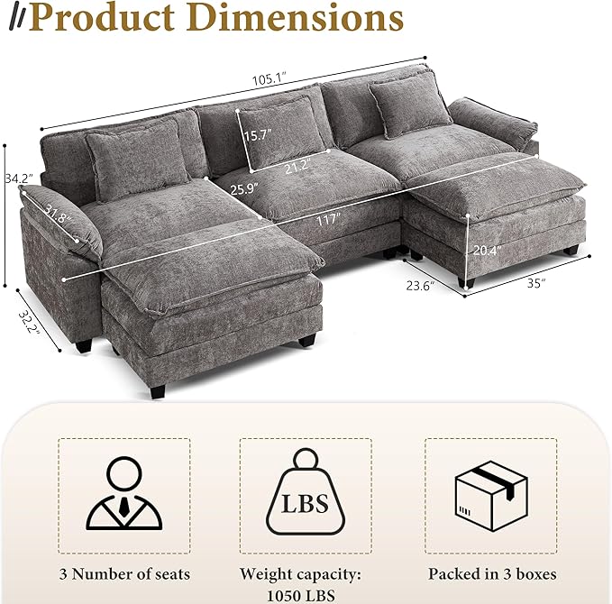 URRED Modular Sectional Sofa Comfy Cloud Couch, Modern Chenille Sofa Sleeper Deep Seat Couches with Ottoman/Pillows for Living Room (Gray, 117'' - U Shape)