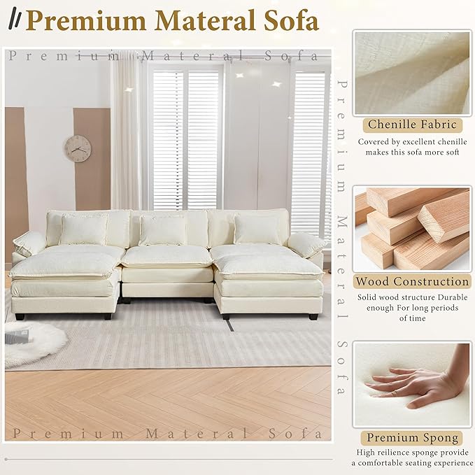 URRED Modular Sectional Sofa Comfy Cloud Couch, Modern Chenille Sofa Sleeper Deep Seat Couches with Ottoman/Pillows for Living Room (White, 117'' - U Shape)
