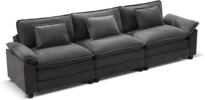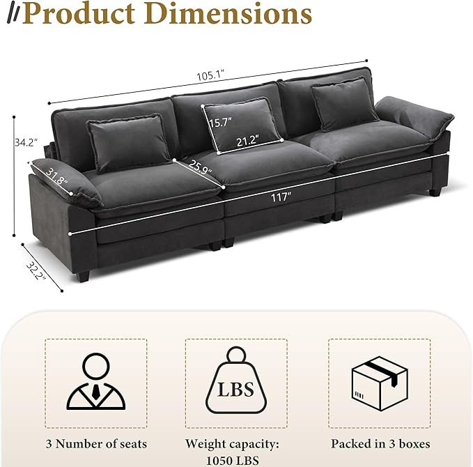 URRED Modular Sectional Sofa Comfy Cloud Couch, Modern Velvet Sofa Sleeper Deep Seat Couches with Ottoman/Pillows for Living Room (Dark Gray, 117'')