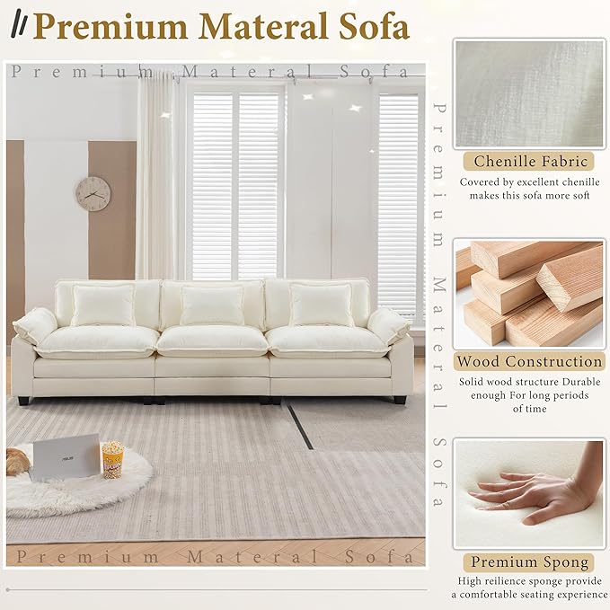 URRED Modular Sectional Sofa Comfy Cloud Couch, Modern Chenille Sofa Sleeper Deep Seat Couches with Ottoman/Pillows for Living Room (White, 117'')