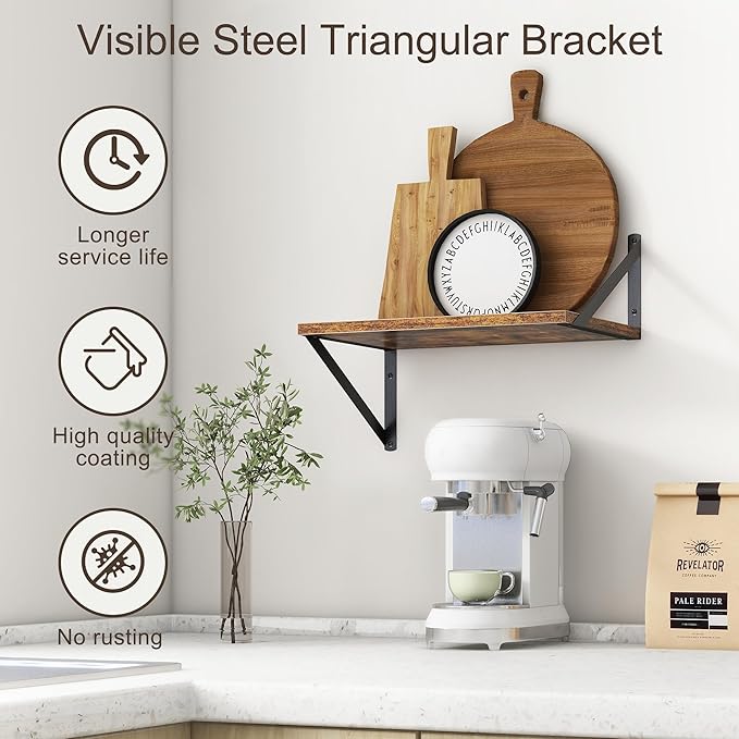 - 【FARMHOUSE RUSTIC WALL SHELF】These floating shelves are made of premium engineered wood board and visible triangular bracket. The rustic wooden grain surface add character and warmth to any modern or traditional interior with these deep floating shelves, contrast shelves at staggering heights on the wall or mount side-by-side or in the corner for a clean streamlined look.