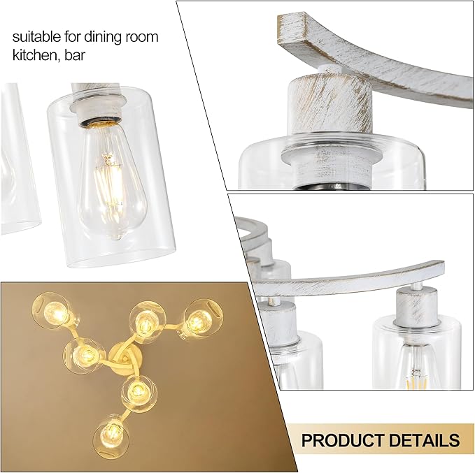 - Modern Style: Antique white glass chandelier has 3 arms that radiate outward from the central arc, presenting a simple but not simple beauty. The body of the antique white pendant light is made of high quality metal and the surface is finished with a handmade antique white lacquer finish. The clear glass shade not only ensures the soft scattering of light, but also complements the cold and hard texture of the metal, making the whole french country light fixture both powerful and delicate. The downward-facing glass shade does not easily accumulate dust and is easy to clean.