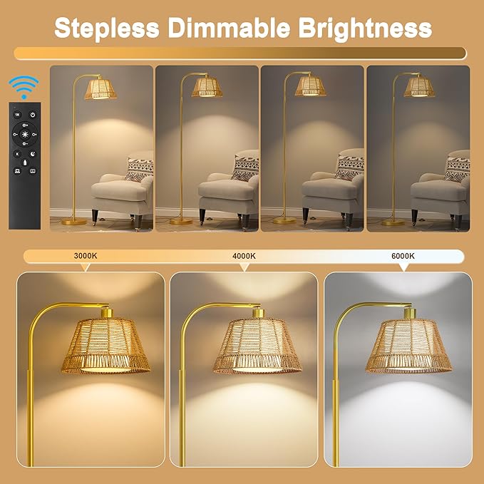 - 【Stepless Dimmable & 3 Color Temperatures】Saving your time to look for compatible bulbs, Our rattan floor lamp comes with an E26 smart bulb, which supports stepless brightness (1%-100%) and 3 color temperatures (3000K-6000K)and timer settings(1hour)as needed, This dimmable floor lamp also have pre-set modes offering various scenes such as: read, nursery, work and night light.The memory function can help you remember the last setting.