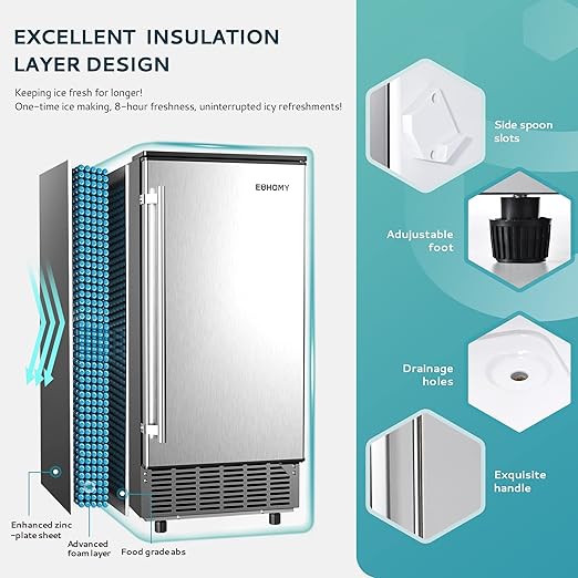 - Reversible Door & Cold Insulation: The stainless steel ice maker machine door with a handle can be installed with left or right hinges, allowing you to choose the opening direction according to your needs. The 3-layer housing material ensures longer-lasting ice cubes, preventing them from melting quickly.