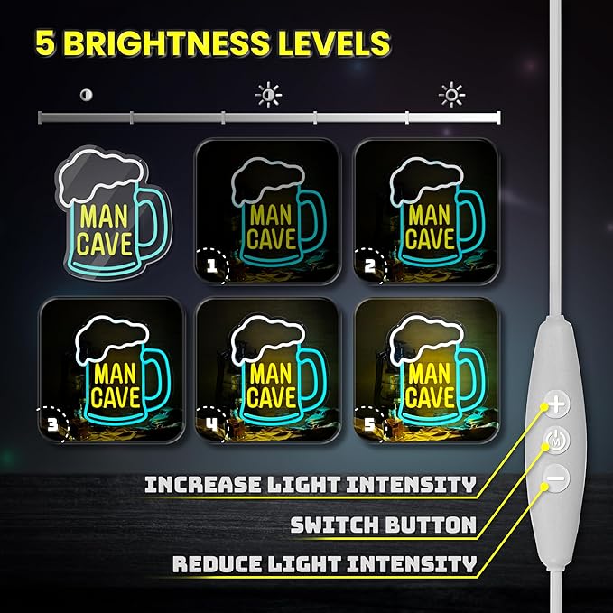 - 【Dimmable】 Man Cave neon sign has 3 smart buttons that can adjust the brightness from 10% to 100% to meet your different lighting needs. After you adjust the brightness, turn it off, and when you turn it on again, the neon sign light will still be the brightness you adjusted, without you having to adjust it again.