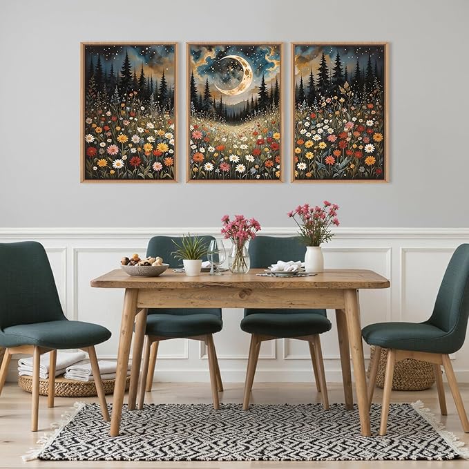 HPINUB Wildflower Moon Forest Framed Canvas Wall Art Set,Nature Pine Tree Wall Decor,Mystical Starry Night Artwork Rustic Mountain Landscape Art Print for Living Room,Bedroom,Office-16 x24 x3