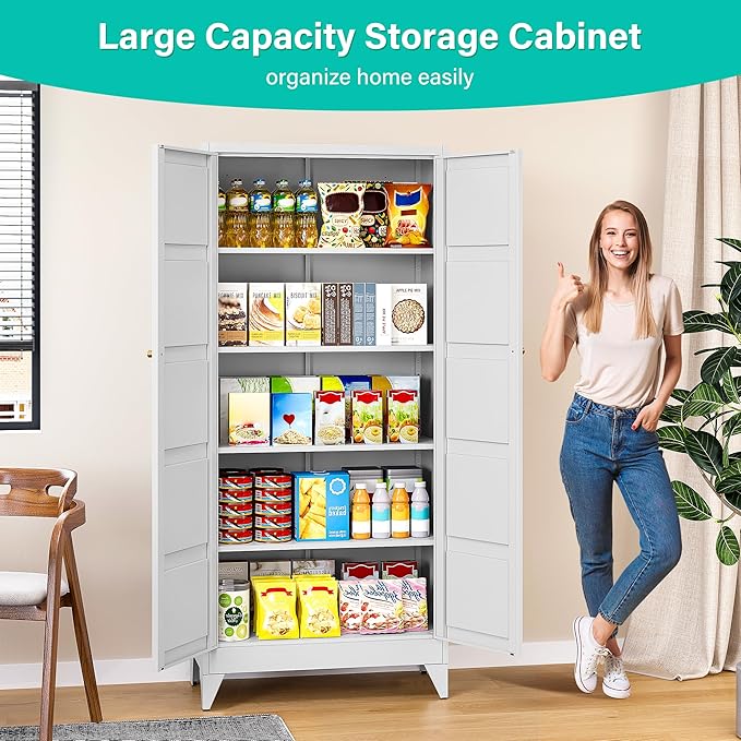 Wide & Deep Metal Storage Cabinet with 2 Doors and 5 Shelves,72 inch Tall Pantry Storage Cabinet,Large Cupboard Closet,White Cabinets for Home,Kitchen,Bathroom,Dining/Living Room