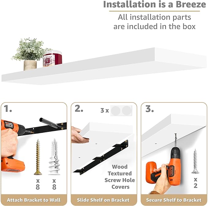 - Floating Shelves for Wall: Display charming showpieces, trophies, photo frames, decorative items, and other prized possessions while offering functional storage with the wooden floating shelves by Sorbus. Enhance home decor, bathroom decor, and living room decor. Use shelves to fill in empty wall space above a desk, fireplace, entryway, vanity, or between windows. Each floating shelf measures approximately 48β x 9β x 1.5β