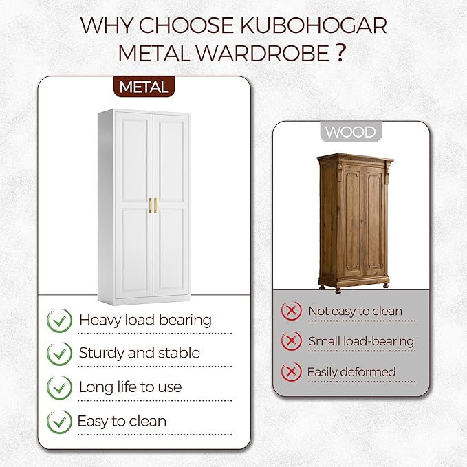 - High quality material: The armoire wardrobe closet is made of thickened cold-rolled steel plate, which is strong and not easy to deform. The metal wardrobe cabinet is treated with environmentally friendly powder coating, which is resistant to moisture, corrosion and rust, and is more durable than wooden cabinets.