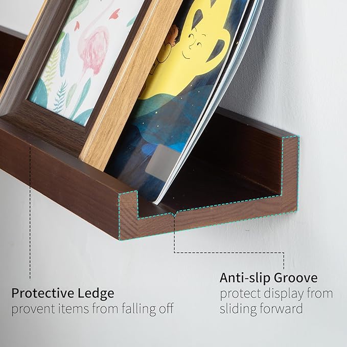 - Picture Ledge Shelves: The raised edge and a groove design prevents items from falling or slipping, offering a secure display space for your picture frames, small plants, photo frames, books, DVD or decorations on these wall storage shelves