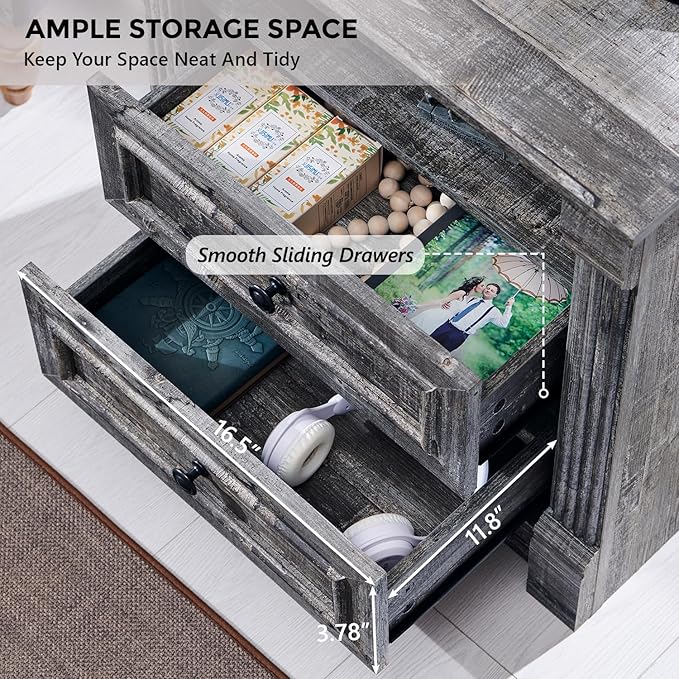 - CONVENIENT CHARGING STATION: Farmhouse nightstand featuring a built-in charging station. Equipped with 2 USB ports and 2 AC power outlets, it ensures your devices are always charged and ready to go. The back panel includes a 2.3-inch diameter cable management hole, keeping your space neat and organized. With a spacious tabletop, you have plenty of room for your essentials and favorite decor