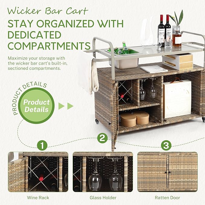 - ORGANIZED STORAGE: Stay organized with the wicker bar cart's dedicated compartments. The cart includes a wine rack and a glass holder, making it easy to store and access your bottles and drinkware. The smart design allows for quick setup and easy access