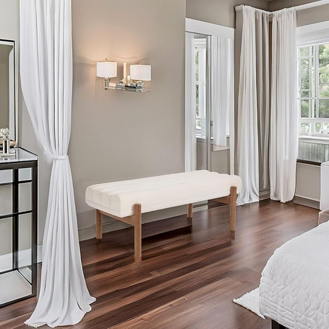 White Modern Bench Upholstered End of Bed Bench Chenille Fabric Bedroom Bench for Entryway Living Room Vanity Makeup Room, 47" Long, Wooden Legs