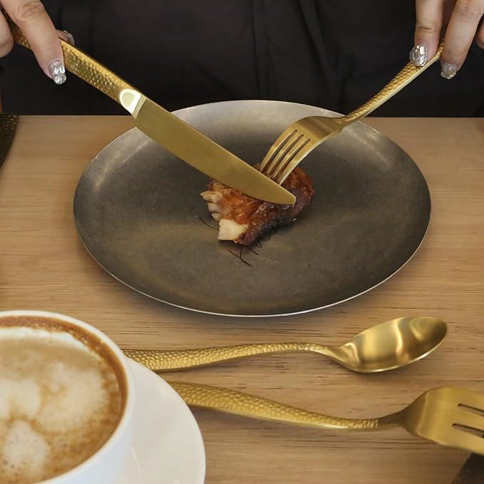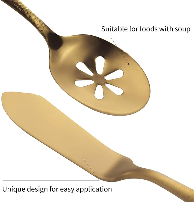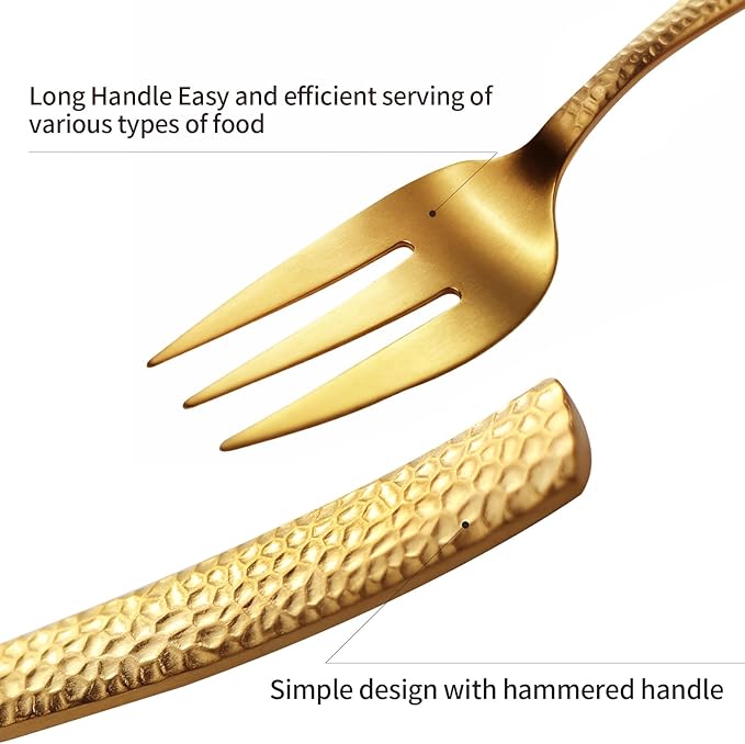 - 【APPEARANCE AND DESIGN】Luxury gold color and matte polish, unique design with hammered handle, dishwasher safe