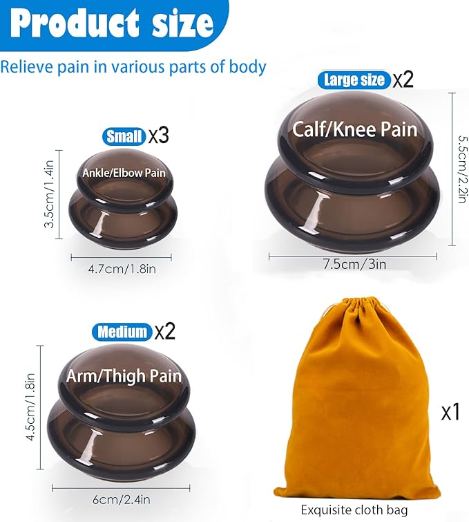 - Include 7pcs Massage Silicone Cups:Large Cups-2pcs, Medium Cups-2pcs, Small Cups-3pcs, A delicate flannel bag, Easy to store those cups.