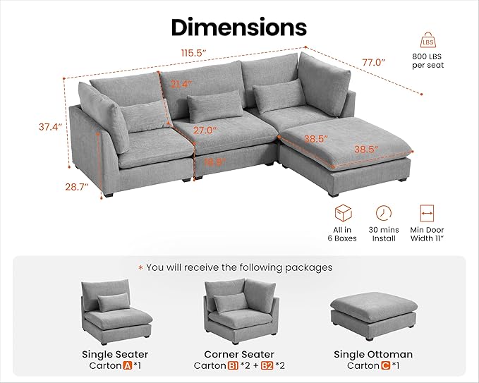 - 【Shipped in Six Packages for Easy Setup】To enhance your convenience, the sectional will be delivered in six packages, allowing for easier handling and assembly. Each package is carefully packed to ensure safety during transit, and while they may arrive at different days, rest assured that our professional customer service is ready to assist you with any concern. The thoughtful design makes the setup process simpler and more efficient,ensuring you enjoy your sectional without any hassle