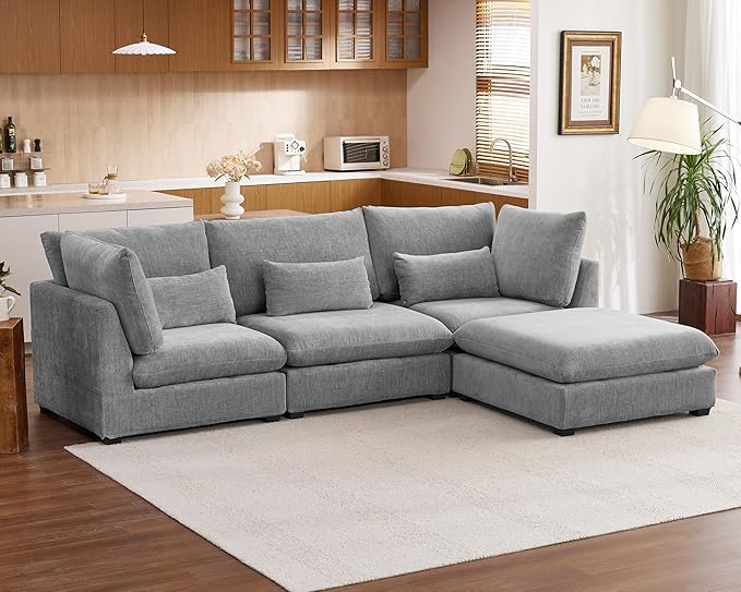 Oversized Modular Sofa, Extra Deep Cloud Chenille Sectional Couch with Ottoman Chaise, Fluffy Chenille 4 Seat L-Shaped Sofa for Living Room, Villa (L Shape 4 Seater, Chenille Grey)