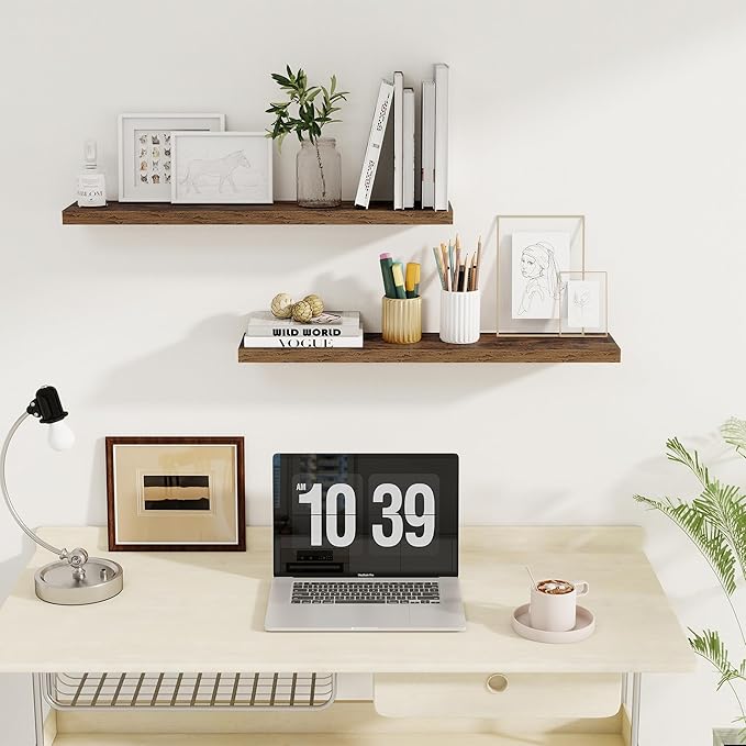 - STYLE & VERSATILITY: Elevate your home with our set of 2 elegant wall shelves, designed for versatile display options. Arrange them side by side for a clean, unified look, or stagger them for a bold, dynamic effect. Adding a touch of sophistication while providing practical storage