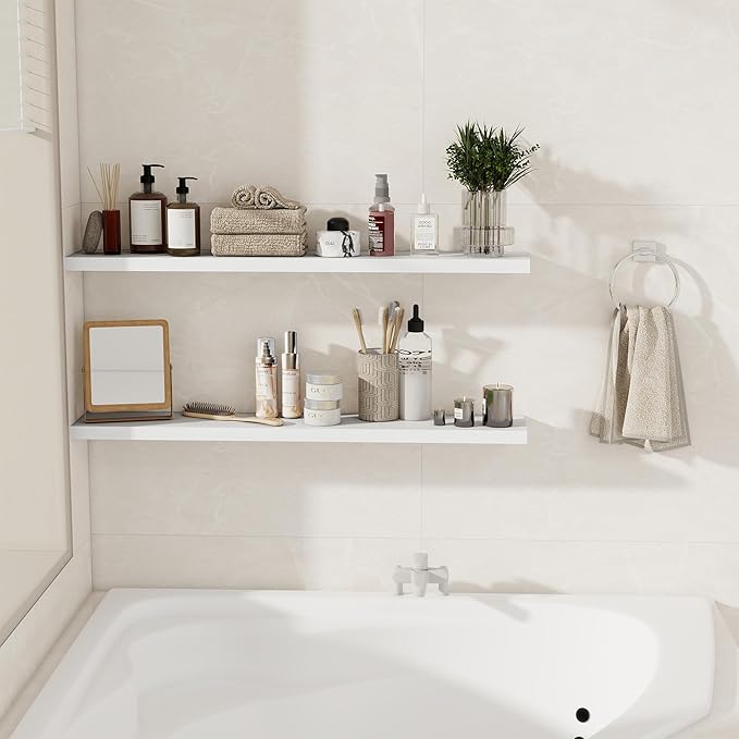 Floating Shelves for Wall, 40 Inch Floating Shelves for Home Decor, Wall Mounted Rustic Wood Shelves, Bathroom, Hanging Deep Shelf for Bedroom, Living Room, Kitchen (White, Set of 2)