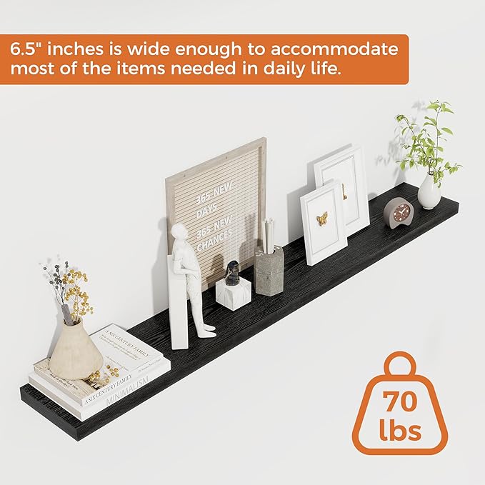 - 48-Inch Floating Shelves for Wall (Set of 2): Each shelf measures 6.5 inches in depth and 1.1 inches in thickness. This 2-piece set offers a more cost-effective and practical storage solution. Fun Memories wall shelves can be installed in a variety of waysβstaggered vertically, side-by-side, or independentlyβto add extra storage and reduce clutter in your kitchen, bathroom, bedroom, and more. Available in multiple colors to suit different decor styles