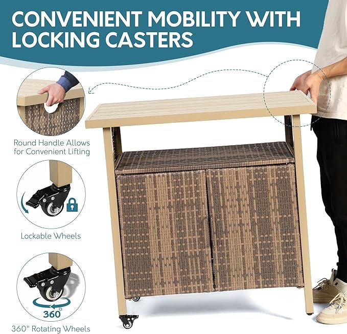 - MULTI-FUNCTIONAL: All-in-one outdoor storage and countertop. The wood-like metal serving as an ideal outdoor food prep station.The wicker cabinet with doors features a storage space, providing ample room to store your items