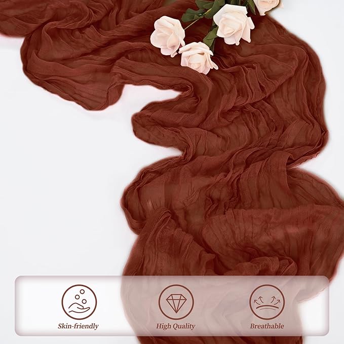 - Cheesecloth Table Runner Size: You will receive 12 terracotta cheesecloth tablerunner, each measuring 20 x 120 inches. The quantity is sufficient for you to decorate various romantic occasions. It can decorate most shaped tables, such as rectangular tables, round tables, and cocktail tables. It is long enough to decorate a large table and be placed perfectly and elegantly on the tabletop, adding a romantic atmosphere to your occasion.