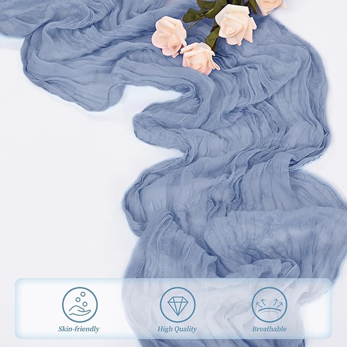 - Soft Table Runner Materials: This cheesecloth table runner is made of high-quality gauze, with a very soft touch and long-lasting durability. The exquisite edge stitching makes it look even more beautiful. It hangs naturally, and the pure plant dye does not fade, has no odor, and can be reused. It is romantic for every occasion of your life.