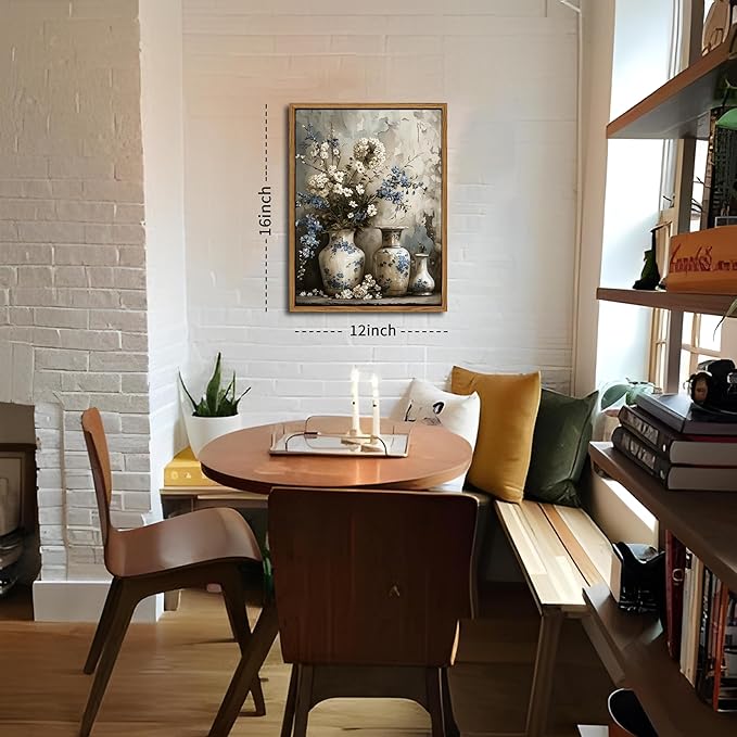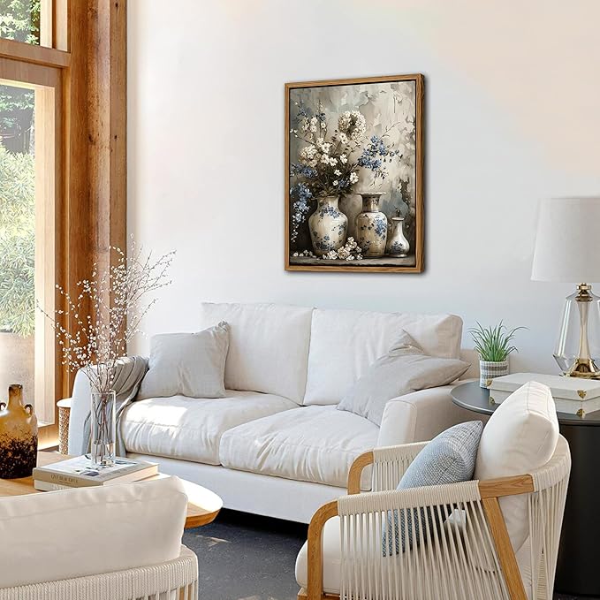 - Framed Canvas Wall Art: This vintage farmhouse floral canvas features elegant blue and white flowers in a charming art jar, capturing a timeless rustic beauty. It’s the perfect accent to enhance your living room, bedroom, bathroom, or any cozy home corner.