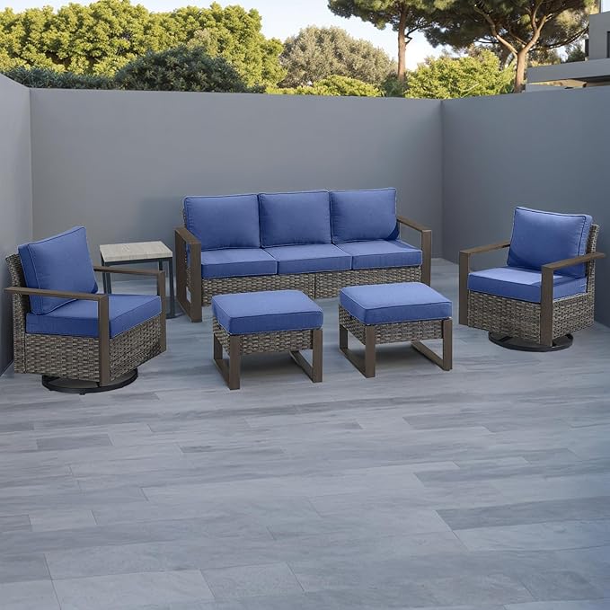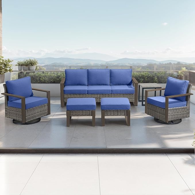 Outdoor Wicker Patio Furniture Set - 6 Piece Patio Conversation Set with 2 Wicker Swivel Rocker Chairs,2 Rattan Ottoman,1 Side Table and 1 Couch,Thick Cushions,Deep Seating(Mixed Grey/Blue)