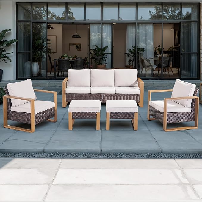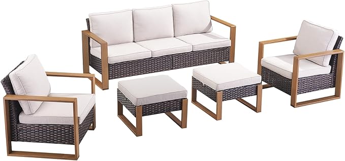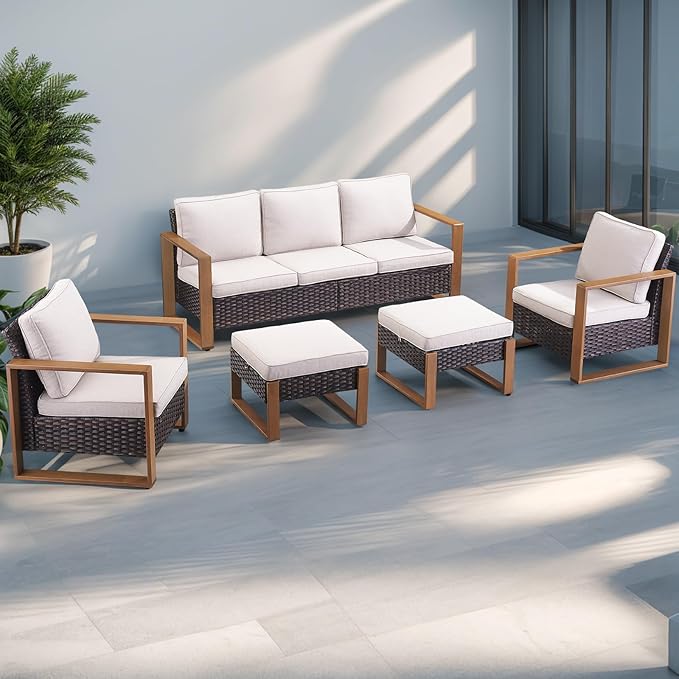 Outdoor Wicker Patio Furniture Set - 5 Piece Patio Conversation Set with 2 Wicker Armrest Chairs,2 Rattan Ottoman and 1 Couch,Sturdy Frame,Thick Cushions,Deep Seating(Brown/Beige)