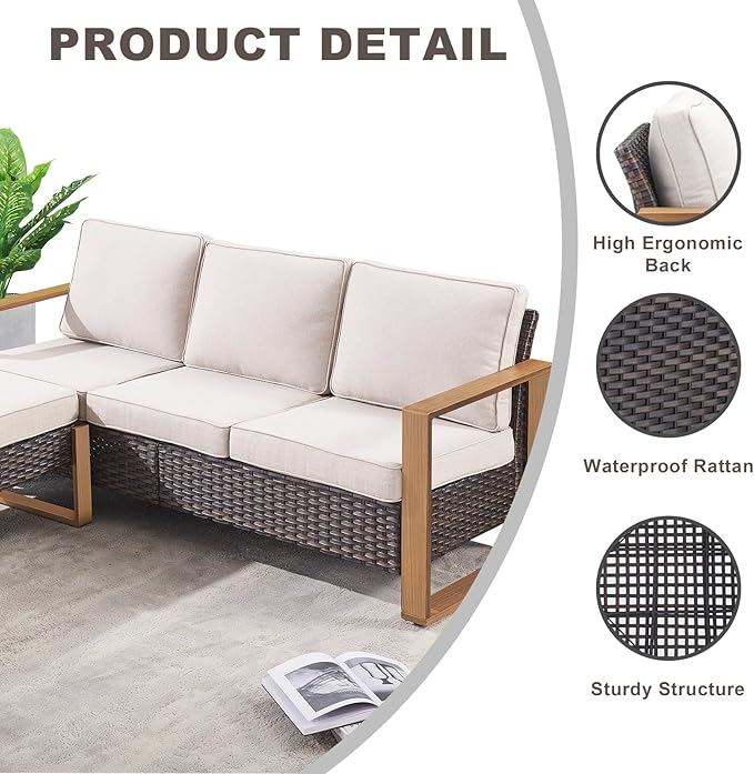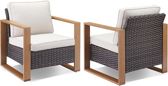 - Stylish Wood-Grain Finish:Elevate your outdoor space with our wicker patio furniture chairs set, featuring a stunning faux wood-grain armrest design that mimics the beauty of natural wood. This environmentally friendly choice not only enhances the ambiance of your garden but also requires minimal maintenance, reducing the demand for real wood. Paired with handcrafted wicker, these sets add a modern touch to any outdoor decor, providing a fresh and inviting look