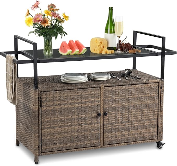 - SPACIOUS RATTAN CABINET: Stay organized with cabinet cart, which includes a large storage cabinet with two magnetic doors. This enclosed outdoor storage cart keeps grilling tools, bar essentials, and outdoor accessories neatly stored