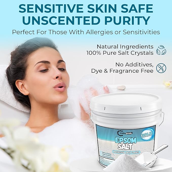 Epsom Salt Bath Soak 30 lb Bucket – Unscented, Pure Epsom Salt Bulk Crystals, Magnesium Sulfate for Full Body or Foot Soaks, Resealable Container with Scoop for Home Bath Use