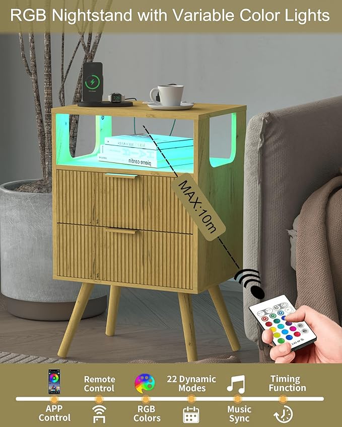 Nightstand with Charging Station and LED Lights,Modern Bedside Table with 2 Storage Drawer and Open Wood Shelf, for Bedroom and Small Spaces,Night Stand with Solid Wood Legs (Yellow Oak)