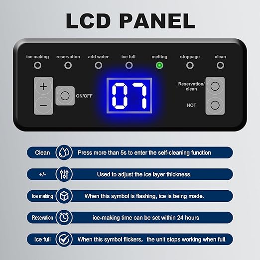 - Intelligent Control Panel: The ice machine is fitted with an user-friendly LCD control panel, allowing you to adjust the 24-hour ice-making schedule as required. The (+) or (-) buttons allow for easy adjustment of the ice cube size, and it includes features like automatic shutdown when the ice bin is full, water shortage alert, self-cleaning mode, forced ice clearing, and power failure memory, which streamline the operation and reduce labor costs.