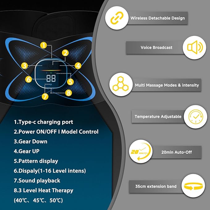 - Heated Comfort for Deep Relaxation: The Abs Stimulator abdominal belt comes with a heating pad that provides 3 different levels of heat, that soothes tense muscles and enhances blood circulation, providing a spa-like experience in the comfort of your home, Perfect for relieving back pain fatigue and stiffness (Direct contact the skin required and keeping the skin moist to ensure thebest massage effectiveness and heat conduction).