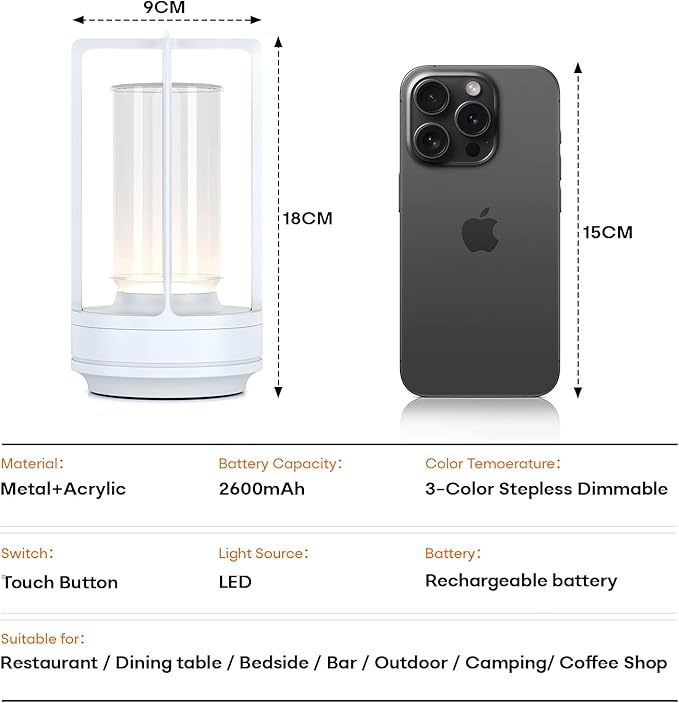 - đź’š [ A perfect gift idea ]: Our touch light lamp can match a variety of scenes and styles while making a great gift. It can be used as an ambient light for Thanksgiving, Christmas and birthday parties. The rechargeable cordless led table lamp is suitable for bedroom, bedside table, office, restaurant, cafe, bar, hotel, outdoor patio lighting, etc.
