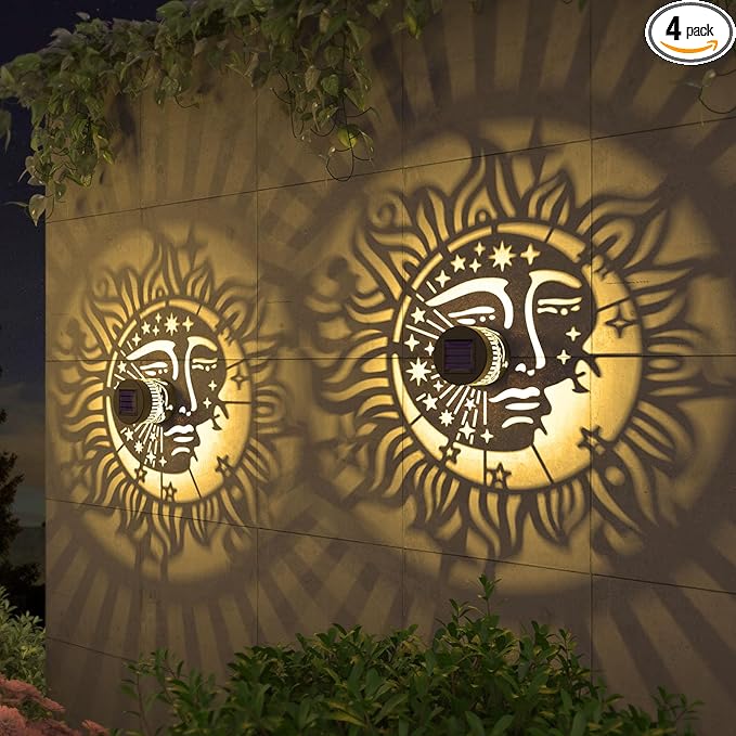 4 Pack Solar Fence Lights Metal Solar Powered Outdoor Wall Deck Step Lights Sun Moon Theme Waterproof Fence Light for Garden Post Patio Backyard Yard Decor, Gardening Gifts for Women Mom Grandma