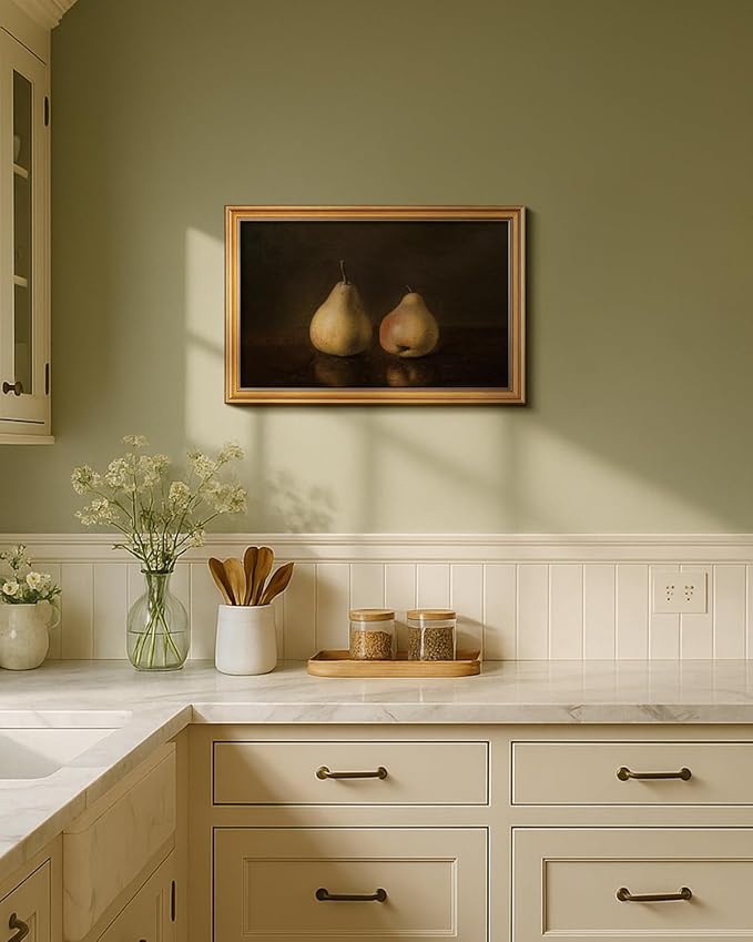 - CLASSICAL ROOM DECOR: Vintage Still Life Pear painting, this wall art picture print utilizes the classic chiaroscuro technique. The two pears, gently leaning toward each other, symbolize a sense of companionship—whether familial, friendly, or romantic. Or abundance, life, and family. The detailed rendering of the fruit’s delicate blemishes and organic imperfections lends an authentic, timeworn charm to the artwork. Inviting viewers to reflect on the beauty of simplicity and everyday life