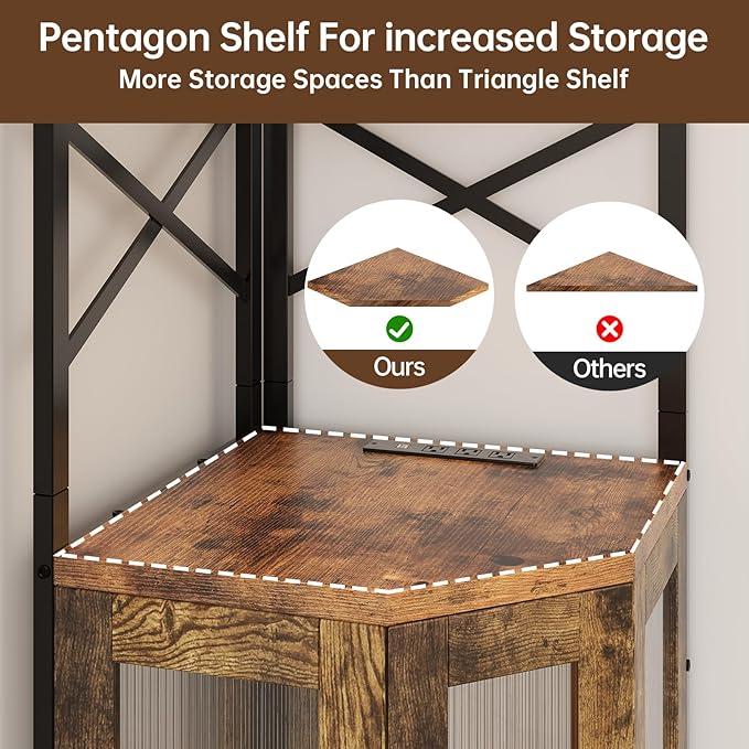 Corner Bar Cabinet with Power Outlet, 5-Tier Corner Wine Cabinet with Led Strip and Glass Holder, Industrial Tall Liquor Cabinet Bar Wine Rack for Home, Rustic Brown