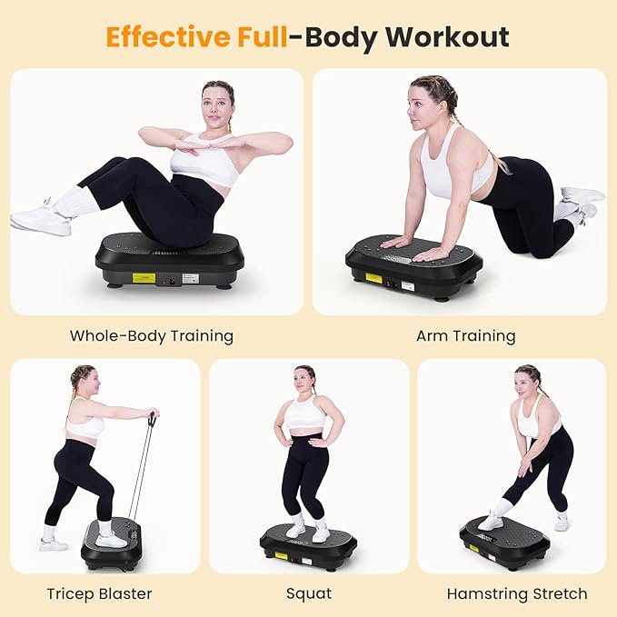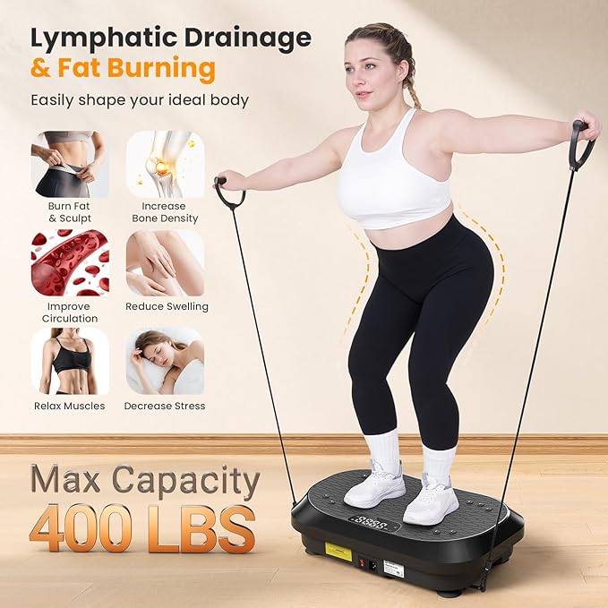 - 【Quiet & Anti-Slip Safety Design】Our vibrating plate exercise machine Features non-slip surface and four suction cups to prevent movement during use. Quiet noise reduction technology won't disturb a sleeping baby. The durable ABS shell supports up to 400 lbs, making it suitable for various body types and an ideal option for home workouts