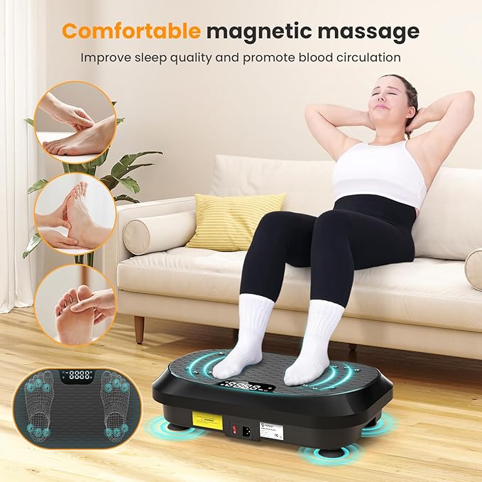 - 【Lymphatic Drainage & Body Relax】The vibration plate exercise machine with magnetic acupressure function stimulates the feet, and the gentle vibrations activate muscles throughout the body to help improve blood circulation, support lymphatic drainage, and promote joint comfort. Just 10 minutes a day can aid in muscle relaxation