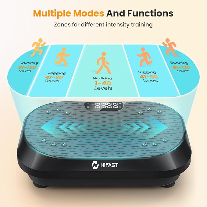 - 【Shape Your Ideal Physique】Hifast vibration plate exercise machine makes body shaping easy and effective. With P1-9 auto modes and 120 adjustable speeds, you can choose your preferred mode and exercise in various positions, helping to burn calories more efficiently than running, assisting you in achieving a healthier body