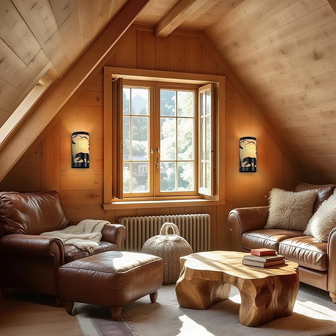 - Rustic Design:The wall sconce light set of 2 are crafted from durable matte black metal,featuring intricate forest elements and a bear silhouette,yellow parchment paper adds a soft,warm glow,enhancing industrial aesthetic of the vintage wall sconce