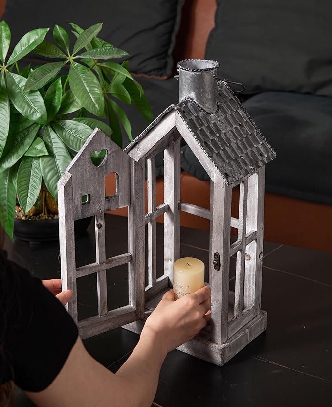- MODERN FARMHOUSE DECOR – This rustic wooden lanterns feature classic house shape with metal corrugated roofs and heart accents in rustic graywash tone that look antique, achieve a modern farmhouse charming and French country touch to your home, decorate your porch, patio or garden more special, chic and vintage.