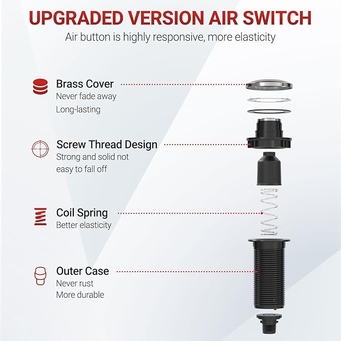 - Garbage Disposal Switch: This garbage disposal comes with an air switch that allows you to control your garbage disposal with the push of a button, helping you keep your kitchen clean quickly and easily.